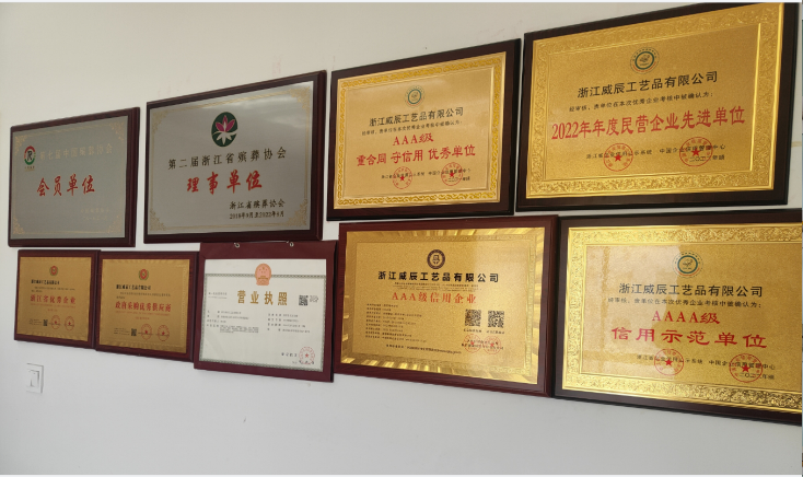 公司通过ISO9001国际质量管理体系认证,ISO14001国际环境管理体系认证,OHSMS职工健康安全管理体系认证。国家安 全生产标准化三级企亚,国家权威检测质量合格产品,AAA 级重合同守信用企业,政府采购供应商,全国质量诚信AAA 级企业,浙江省企业,全国殡葬设备行业产品质量公证十佳品牌,中国节能环保产品,中国环境标志产品,产品营销网络己达到全国20多个省市,获得广大客户的认可与支持。公司将继续努力,以产品质量为核心,以公司信誉为生命,以客户服务为导向,锐意进取,开拓创新,进一步做强做大企业品牌,竭诚欢迎各新老客户携手发展共创双赢。